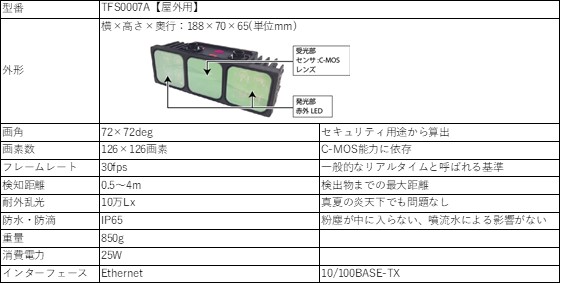 高速点滅した赤外光(850nm)を照射し、物体に反射した光の遅れを測定する事により、距離と画像を認識するセンサです。