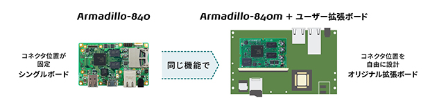 。設計負担の大きいCPU周りはArmadillo-840mを使い、評価ボードの回路図を参考に拡張インターフェース部分を自由に開発することができるので、スピーディな製品化につながります。