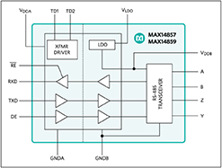 絶縁型RS-485/RS-422トランシーバのMAX14857/MAX14859は、5000VRMS (60秒)のガルバニック絶縁をデバイスのケーブル側(RS-485/RS-422ドライバ/レシーバ側)とUART側の間に提供します。絶縁は、ポート間に大きいグランド電位の差がある場合に、グランドループを切断しノイズを低減することで通信を改善します。これらのデバイスは、最大500kbps (MAX14857)または25Mbps (MAX14859)の堅牢な通信を実現します。