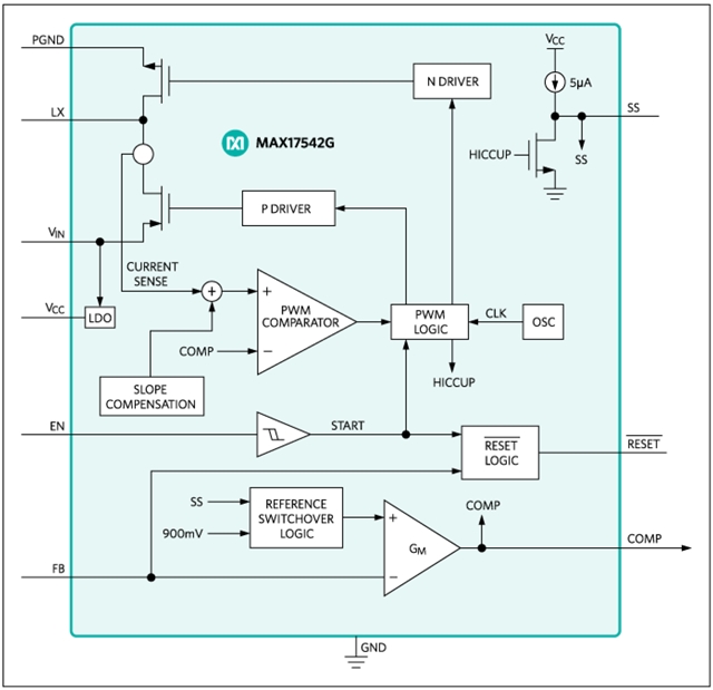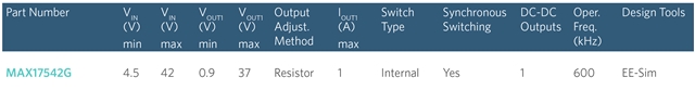 MAX17542Gは、パルス幅変調(PWM)のピーク電流モード制御を使用し、あらゆる負荷で600kHzの固定スイッチング周波数で動作します。このデバイスは、10ピンTDFNパッケージ(3mm x 2mm)で提供されます。シミュレーションモデルが利用可能です。