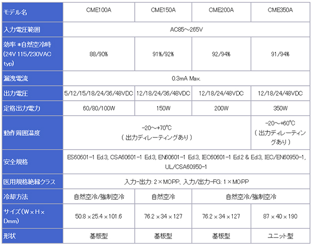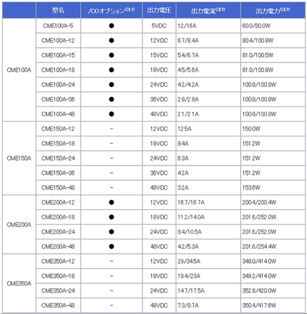 - 高効率:最大効率94%(CME350A-24、230VAC入力時)