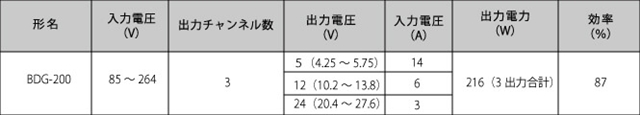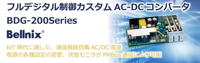 BDG-200Seriesは、フルデジタル制御を採用した、セミカスタムAC-DC電源です。出力電圧の異なる3種類のユニットを、最大3つまで、自由な組み合わせで選択することができます。PMBusによる通信機能を搭載しており、出力電圧、過電流保護動作点、シーケンス、スイッチング周波数等の設定を変えられる他、電源の状態モニタをすることが可能です。