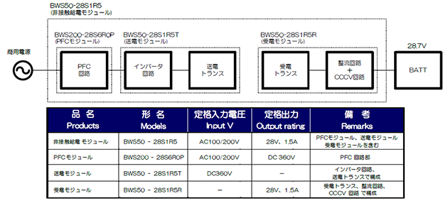 BWSシリーズはPFCモジュール、送電モジュール、受電モジュールの3つで構成されており、非接触給電に必要な商用電源からバッテリーまでの電気回路をモジュールとして提供致します。