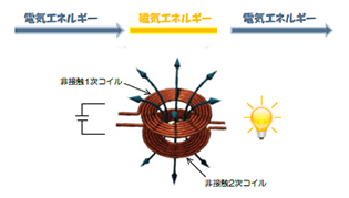 この生じた電気エネルギーを磁気エネルギーに変換し、総受電コイル間を伝送させることで、非接触(ワイヤレス・コンタクトレス)な電力伝送を実現しています。