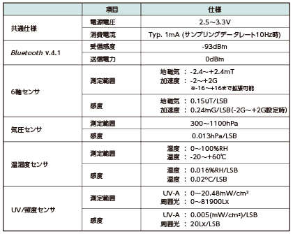 ●6軸(地磁気+加速度)、圧温湿照度センサを搭載