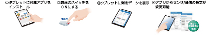 タブレットに付属アプリをインストールし、スイッチをオンするだけで測定データを表示可能です。