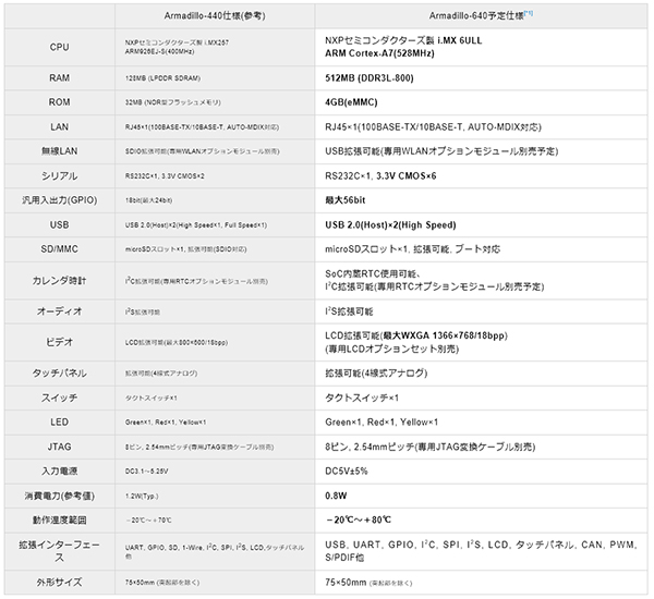 Armadillo-640は、Armadillo-440よりも動作温度範囲を拡大し、-20℃~+80℃をカバーする予定です。