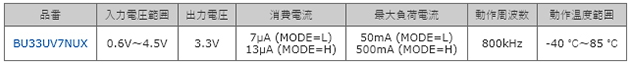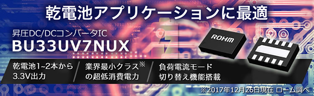 近年、リモコンやウエアラブル機器など小型の電池で駆動する電子機器の普及が著しく進んでおり、これらに搭載されるデバイスは、電池を長持ちさせるために低消費電力化が強く求められています。BU33UV7NUXは、低消費電力化の要望に応え開発された、昇圧タイプ電源ICです。