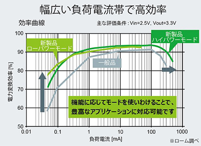 例えば、同じリモコンでも液晶パネルなどを採用した高機能品にも対応できるよう、負荷電流モード切り替え機能を搭載しており、MODE端子を切り替えるだけで、標準品から高機能品まで幅広い乾電池アプリケーションに対して省エネ性能を発揮することが可能です。標準品に対してはローパワーモード(最大負荷電流50mA、消費電流7µA、PFM*1)制御)を、高機能品に対してはハイパワーモード(最大負荷電流500mA、消費電流13µA、PFM / PWM*1)自動切換え制御)を採用することで、幅広い条件下で最大94%の高効率電力変換を実現可能です。