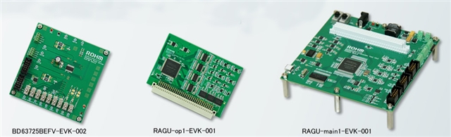 「RAGU®シリーズ」は、工数のかかるモータとモータドライバLSIの動作を簡単に評価できるようにするために開発されたモータドライバLSI評価ツールとして、メインボード、オプションボード、モータドライバLSIを搭載する各種DUTボード、PC上で制御するためのアプリケーションソフトで構成されます。